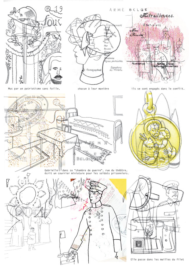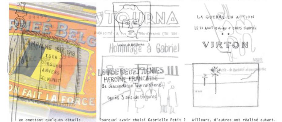 Au fur et à mesure de mes recherches, je découvris l'histoire de Gabrielle Petit, héroïne de la Grande Guerre. Son destin glorifié et son histoire personnelle m'ont amenée à comprendre la manière dont se construit un mythe. Un travail de recoupements d'informations et d'investigations sur les lieux de sa vie ont apporté à ce projet une lecture en couches. La technique de superposition de dessins sur papier calque correspond à cette réflexion.